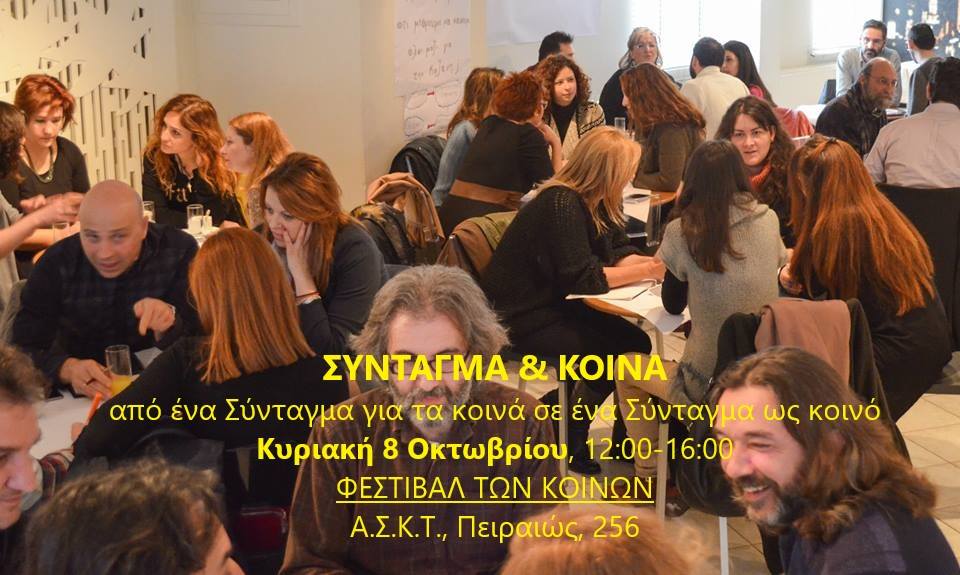 Στο πλαίσιο του Φεστιβάλ των Κοινών, Κυριακή 8 Οκτωβρίου 12:30-16:30, κτίριο Ανωτάτης Σχολής Καλών Τεχνών – πρωτοβουλίες που δραστηριοποιούνται υπέρ της θεσμικής κατοχύρωσης της συμμετοχής των πολιτών στις πολιτικές αποφάσεις, συναντώνται γύρω από το θέμα “Κοινά & Σύνταγμα”, προτείνουν σειρά ομιλιών και προσκαλούν κάθε ενδιαφερόμενο να συμμετάσχει σε μια συζήτηση με τη μέθοδο world cafe.