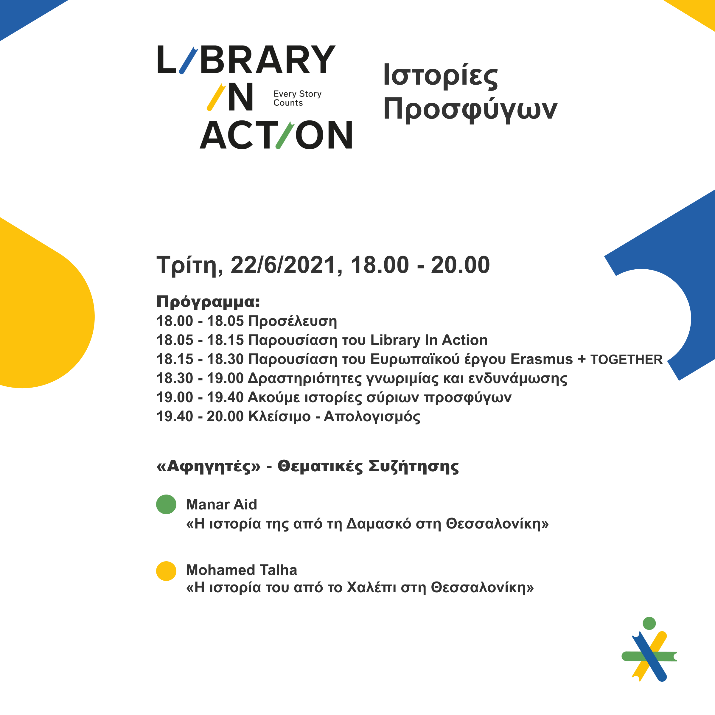Με αφορμή την Παγκόσμια Ημέρα Προσφύγων, που τιμάται κάθε χρόνο από το 2001 στις 20 Ιουνίου το Library In Action / Βιβλιοθήκη σε Δράση και το ευρωπαϊκό πρόγραμμα Erasmus + TOGETHER σας προσκαλούν σε διαδραστικό, διαδικτυακό workshop με θέμα: «Ιστορίες Προσφύγων», την Τρίτη 22/06/2021, μέσω της πλατφόρμας ZOOM στις 18.00. Η συγκεκριμένη δράση πραγματοποιείται σε συνεργασία με το Together Project, τη Νομική Σχολή του Α.Π.Θ και τον Όμιλο UNESCO Νέων Θεσσαλονίκης.