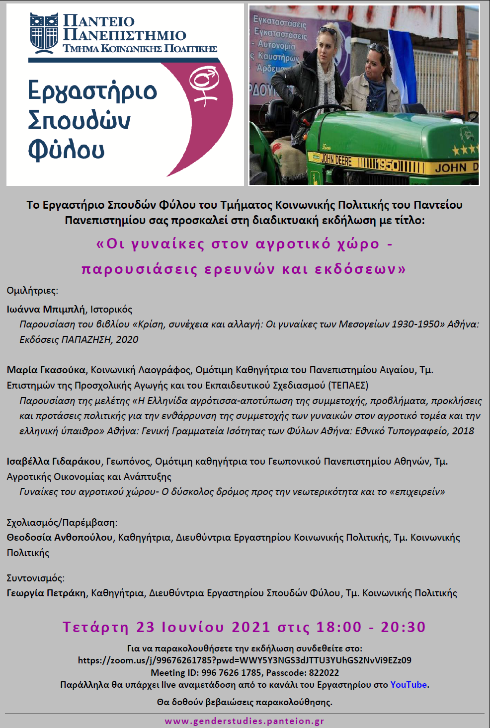 Το Εργαστήριο Σπουδών Φύλου του Τμήματος Κοινωνικής Πολιτικής του Παντείου σας προσκαλεί την Τετάρτη 23 Ιουνίου στις 18:00 – 20:30 στη διαδικτυακή εκδήλωση με τίτλο: «Οι γυναίκες στον αγροτικό χώρο- παρουσιάσεις ερευνών και εκδόσεων».