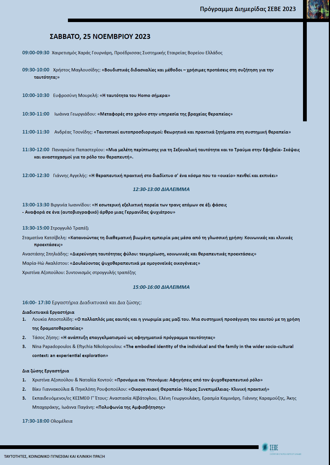 Παρακαλούμε συμβουλευτείτε το επίσημο πρόγραμμα της Διημερίδας ΣΕΒΕ 2023, πάνω στο οποίο πατώντας μπορείτε να δείτε αναλυτικά τις περιλήψεις των εισηγήσεων και των εργαστηρίων.