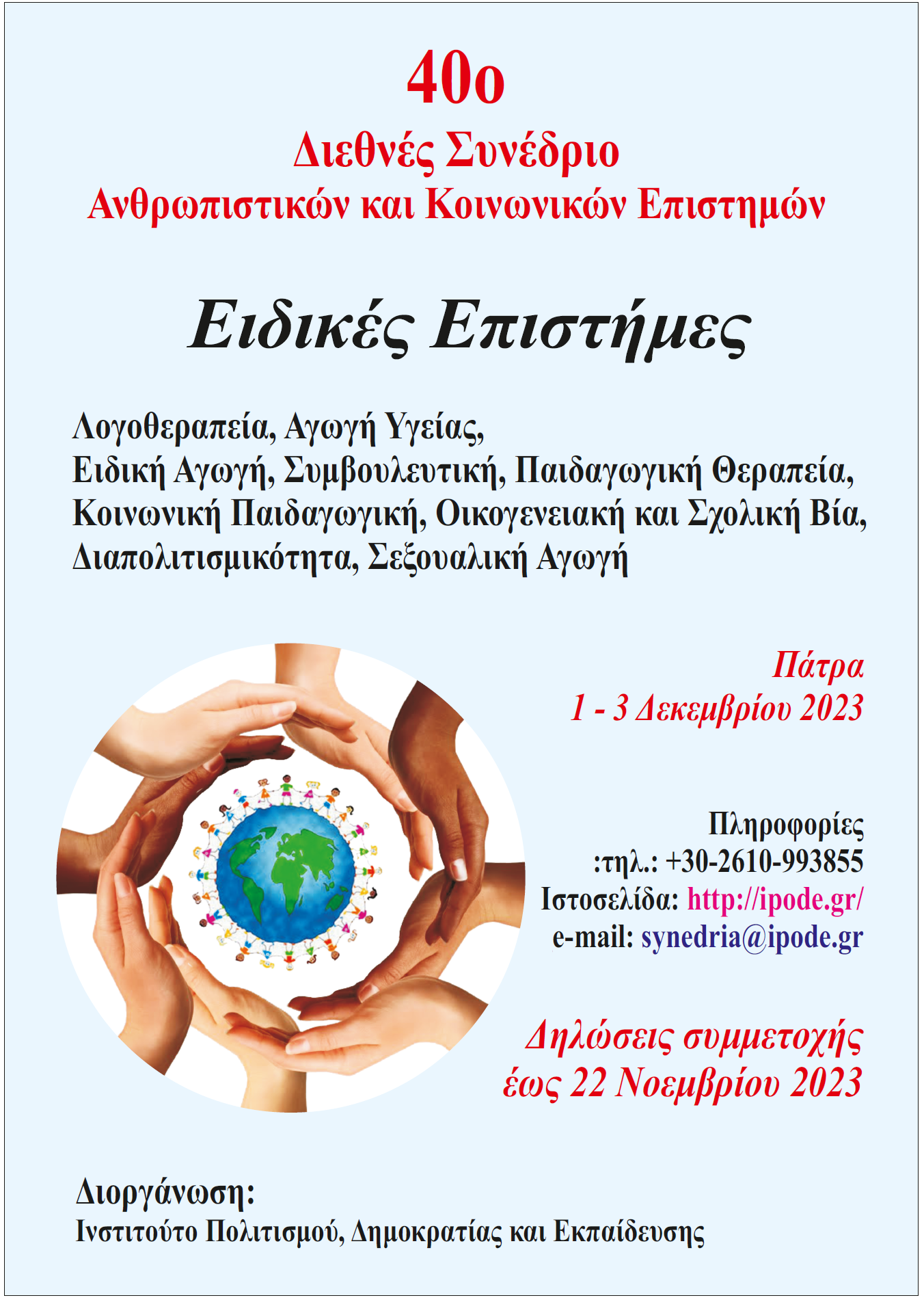 To Ινστιτούτο Πολιτισμού, Δημοκρατίας και Εκπαίδευσης (Ι.ΠΟ.Δ.Ε.), διοργανώνει το 40ο Διεθνές Συνέδριο Ανθρωπιστικών και Κοινωνικών Επιστημών με θέμα: «Ειδικές επιστήμες: Λογοθεραπεία, Αγωγή Υγείας, Ειδική Αγωγή, Συμβουλευτική, Παιδαγωγική Θεραπεία, Κοινωνική Παιδαγωγική-Οικογενειακή και σχολική Βία, Διαπολιτισμικότητα, Σεξουαλική Αγωγή», που απευθύνεται, μεταξύ άλλων, και σε εκπαιδευτικούς πρωτοβάθμιας και δευτεροβάθμιας εκπαίδευσης και θα πραγματοποιηθεί διαδικτυακά (μέσω Zoom) και δια ζώσης από Παρασκευή 1 έως και Κυριακή 3 Δεκεμβρίου 2023 στον Συνεδριακό Χώρο του Ινστιτούτου Πολιτισμού, Δημοκρατίας και Εκπαίδευσης στην Πάτρα (Αντωνίου Οικονόμου 8, Άγιος Βασίλειος) ενώ παράλληλα θα μεταδοθεί ζωντανά στο κανάλι του Ι.ΠΟ.Δ.Ε. στο Youtube: https://www.youtube.com/@ipodegr5328 για ελεύθερη παρακολούθηση.