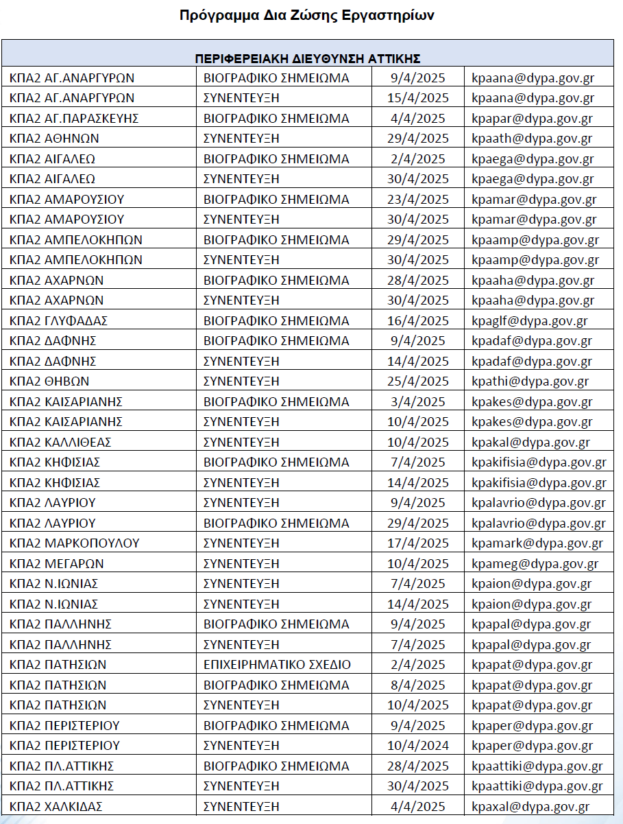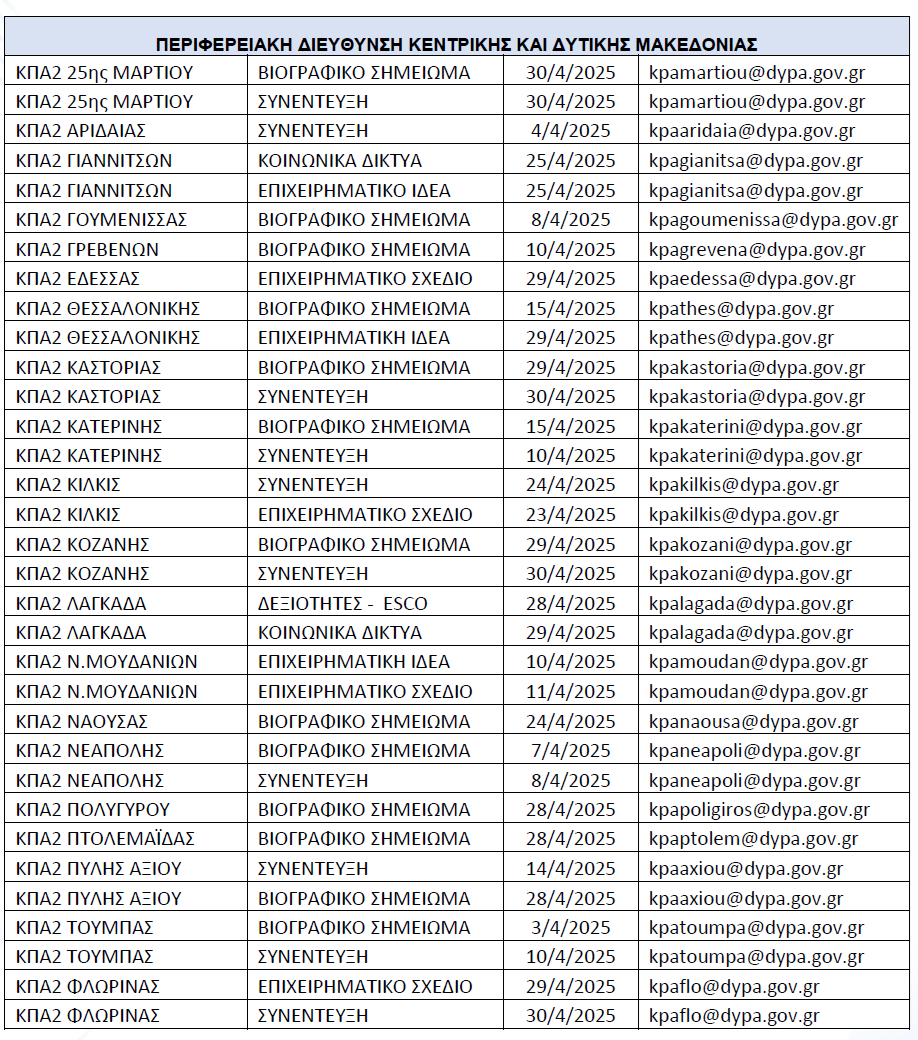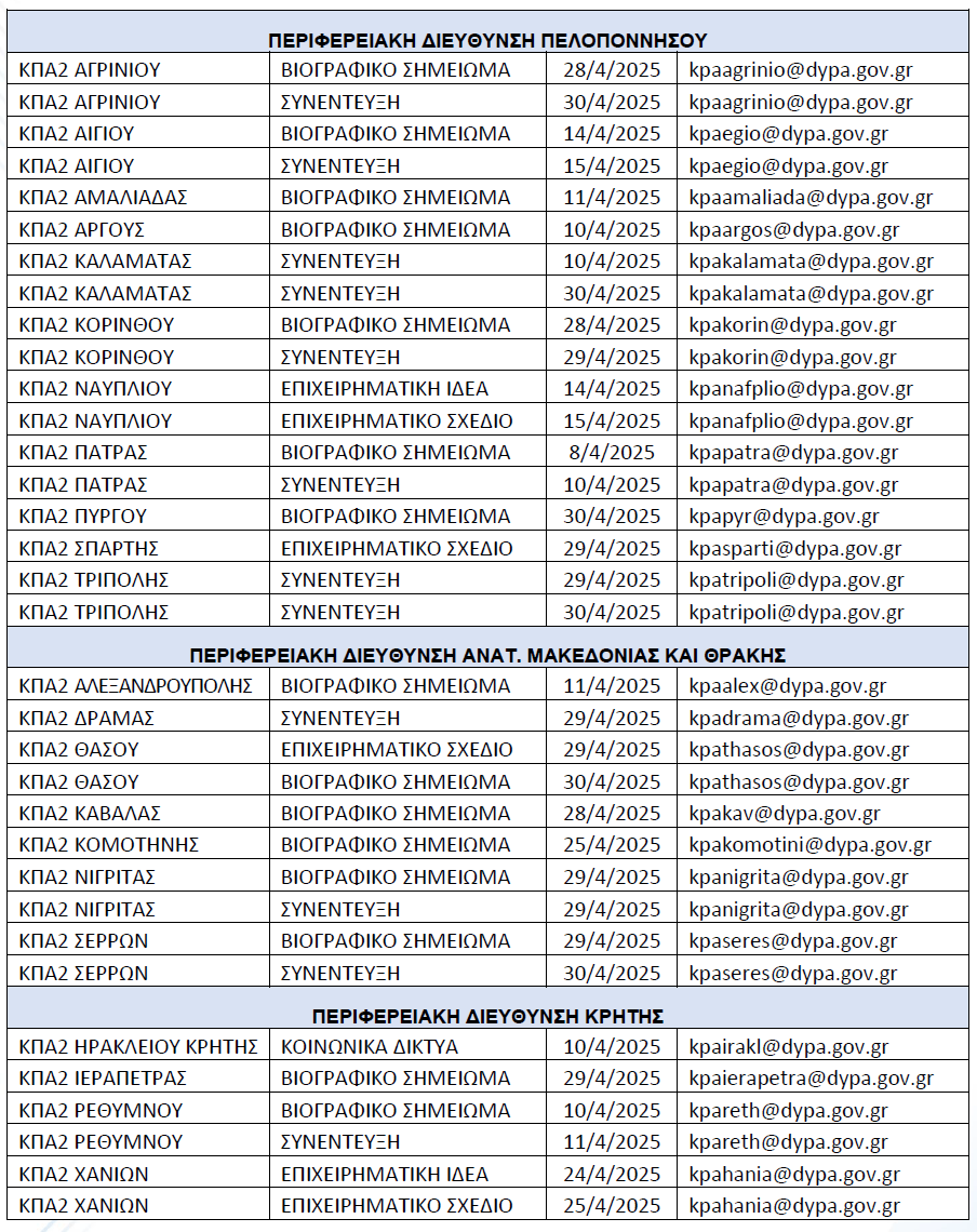 Οι ενδιαφερόμενοι εγγεγραμμένοι στο ψηφιακό μητρώο της ΔΥΠΑ μπορούν να δηλώσουν συμμετοχή ηλεκτρονικά, στέλνοντας μήνυμα (email) με τα στοιχεία επικοινωνίας τους στη διεύθυνση ηλεκτρονικού ταχυδρομείου του ΚΠΑ2 (δείτε πίνακα), το οποίο υλοποιεί το εργαστήριο που τους ενδιαφέρει.