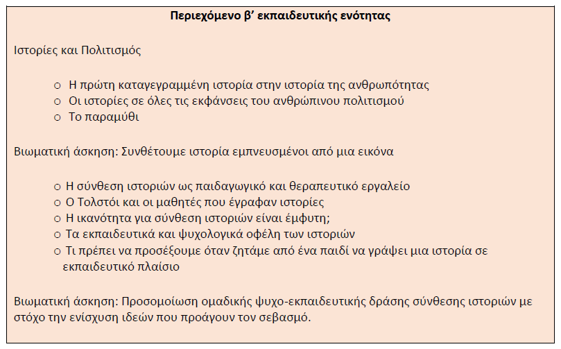 Β’ Ενότητα: Η σύνθεση ιστοριών ως εργαλείο για την ανάπτυξη θετικών στάσεων και συνεργασίας μεταξύ των παιδιών (Σάββατο, 9.00-12.15)