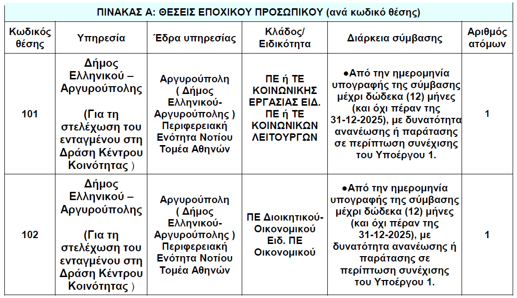 Ο Δήμος Ελληνικού – Αργυρούπολης ανακοινώνει την πρόσληψη με σύμβαση εργασίας ιδιωτικού δικαίου ορισμένου χρόνου, συνολικά δύο (2) ατόμων και συγκεκριμένα ενός (1) ατόμου κατηγορίας ΠΕ ή ΤΕ ειδικότητας Κοινωνικών Λειτουργών και ενός (1) ατόμου κατηγορίας ΠΕ ειδικότητας Οικονομικού, στο πλαίσιο υλοποίησης της Πράξης “Συνέχιση Λειτουργίας Κέντρου Κοινότητας Δήμου Ελληνικού – Αργυρούπολης”.