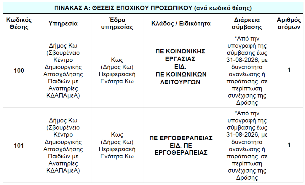 Ο Δήμος Κω ανακοινώνει την πρόσληψη, με σύμβαση εργασίας ιδιωτικού δικαίου ορισμένου χρόνου, συνολικά πέντε (5) ατόμων για την υλοποίηση της δράσης «Προώθηση και υποστήριξη παιδιών για την ένταξή τους στην προσχολική εκπαίδευση καθώς και για την πρόσβαση παιδιών σχολικής ηλικίας, εφήβων και ατόμων με αναπηρία, σε υπηρεσίες δημιουργικής απασχόλησης» της χρονικής περιόδου 2025-2026 του Προγράμματος «Νότιο Αιγαίο 2021-2027» στον Δήμο Κω.