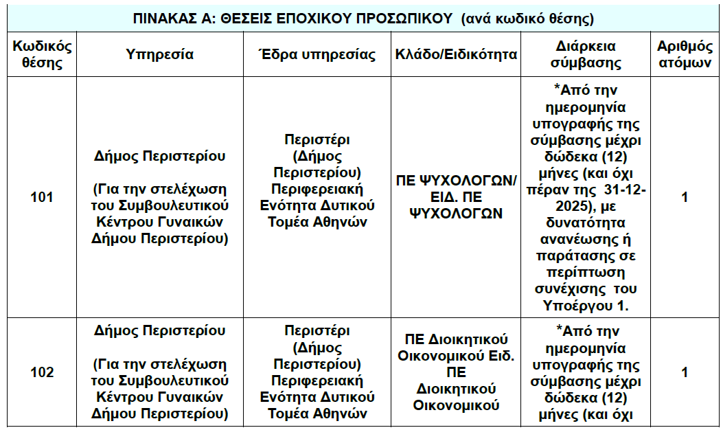Ο Δήμος Περιστερίου ανακοινώνει την πρόσληψη, με σύμβαση εργασίας ιδιωτικού δικαίου ορισμένου χρόνου συνολικά δύο (2) ατόμων, για την υλοποίηση του Υποέργου 1 «Συνέχιση λειτουργίας Συμβουλευτικού Κέντρου στο Δήμο Περιστερίου».