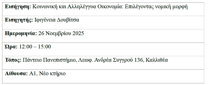 Το Πάντειο Πανεπιστήμιο διοργανώνει θεματική εισήγηση αφιερωμένη στην κατανόηση του πλαισίου της Κοινωνικής και Αλληλέγγυας Οικονομίας και στις επιλογές νομικής μορφής για όσους επιθυμούν να δραστηριοποιηθούν σε αυτόν τον τομέα.