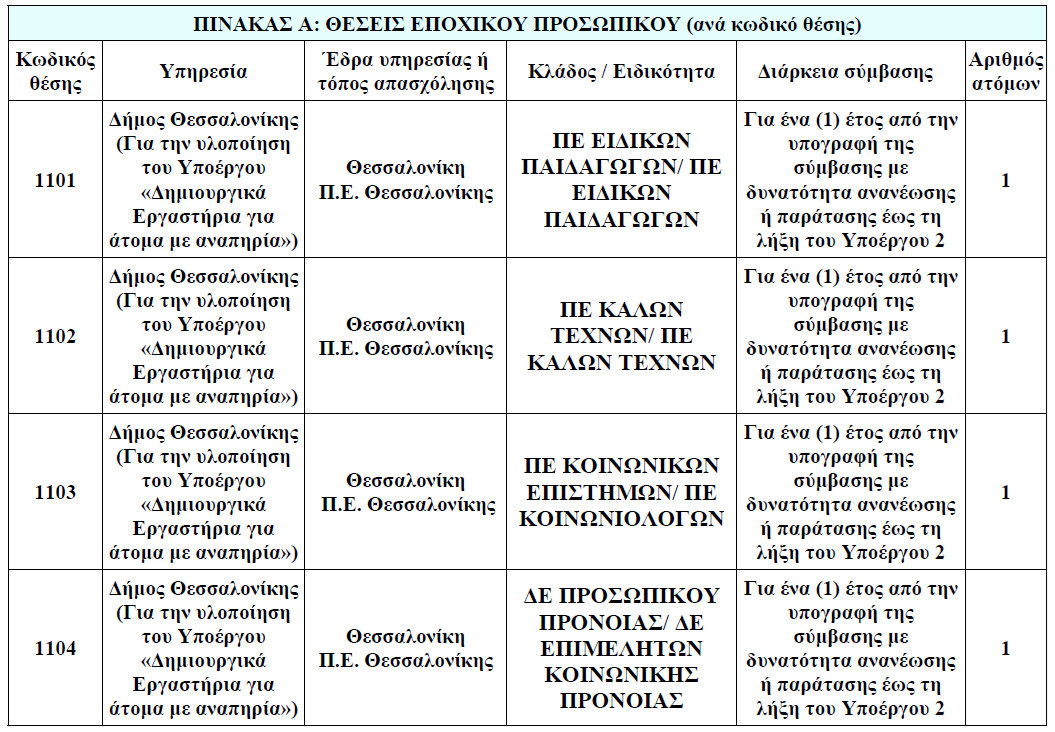 Ο Δήμος Θεσσαλονίκης πρόσληψη, με σύμβαση εργασίας ιδιωτικού δικαίου ορισμένου χρόνου, τεσσάρων (4) ατόμων για την υλοποίηση του Υποέργου 2 «Δημιουργικά Εργαστήρια για άτομα με αναπηρία», της Πράξης «Ολοκληρωμένες υπηρεσίες υποστήριξης για άτομα με αναπηρία, χρόνιες παθήσεις και τις οικογένειές τους, στο Δήμο Θεσσαλονίκης».
