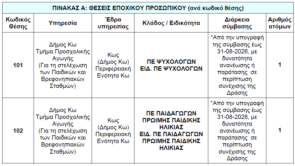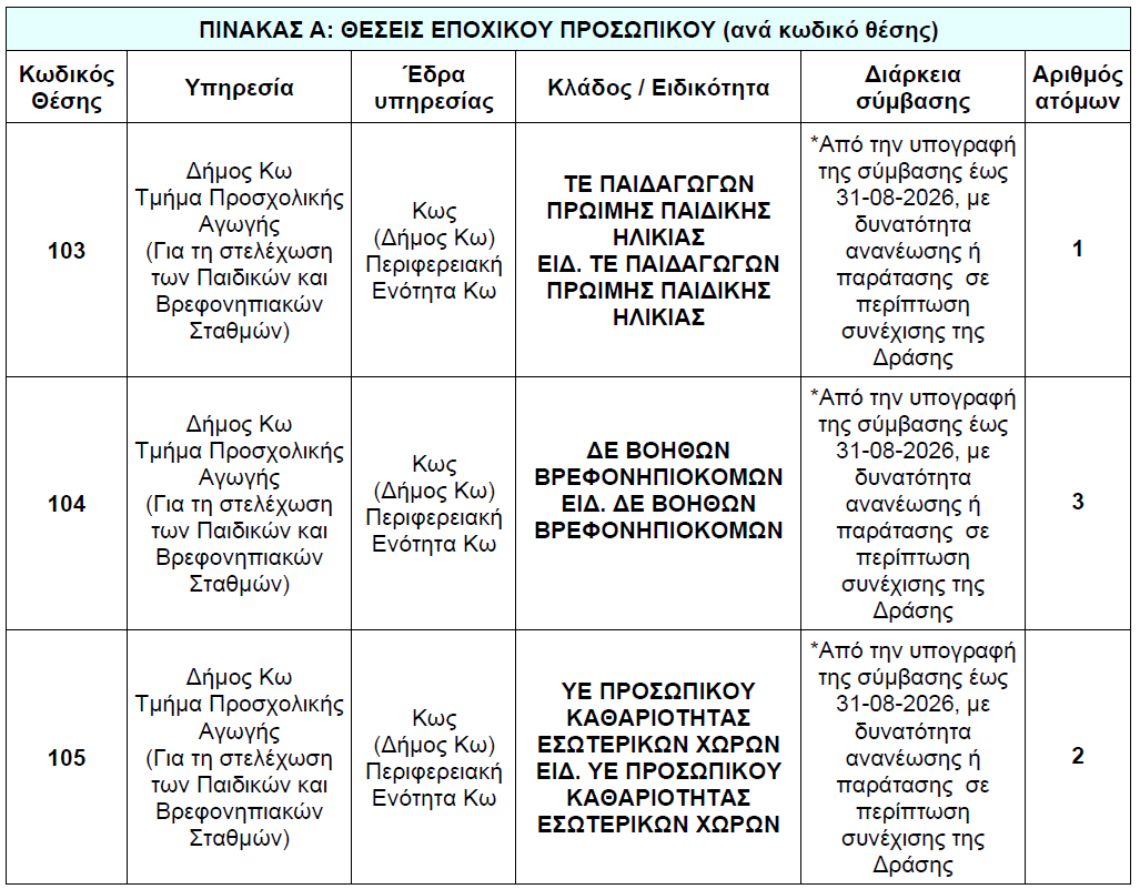 Ο Δήμος Κω ανακοινώνει την πρόσληψη οκτώ (8) ατόμων, με σύμβαση εργασίας ιδιωτικού δικαίου ορισμένου χρόνου, για τις ανάγκες των Βρεφονηπιακών Σταθμών.