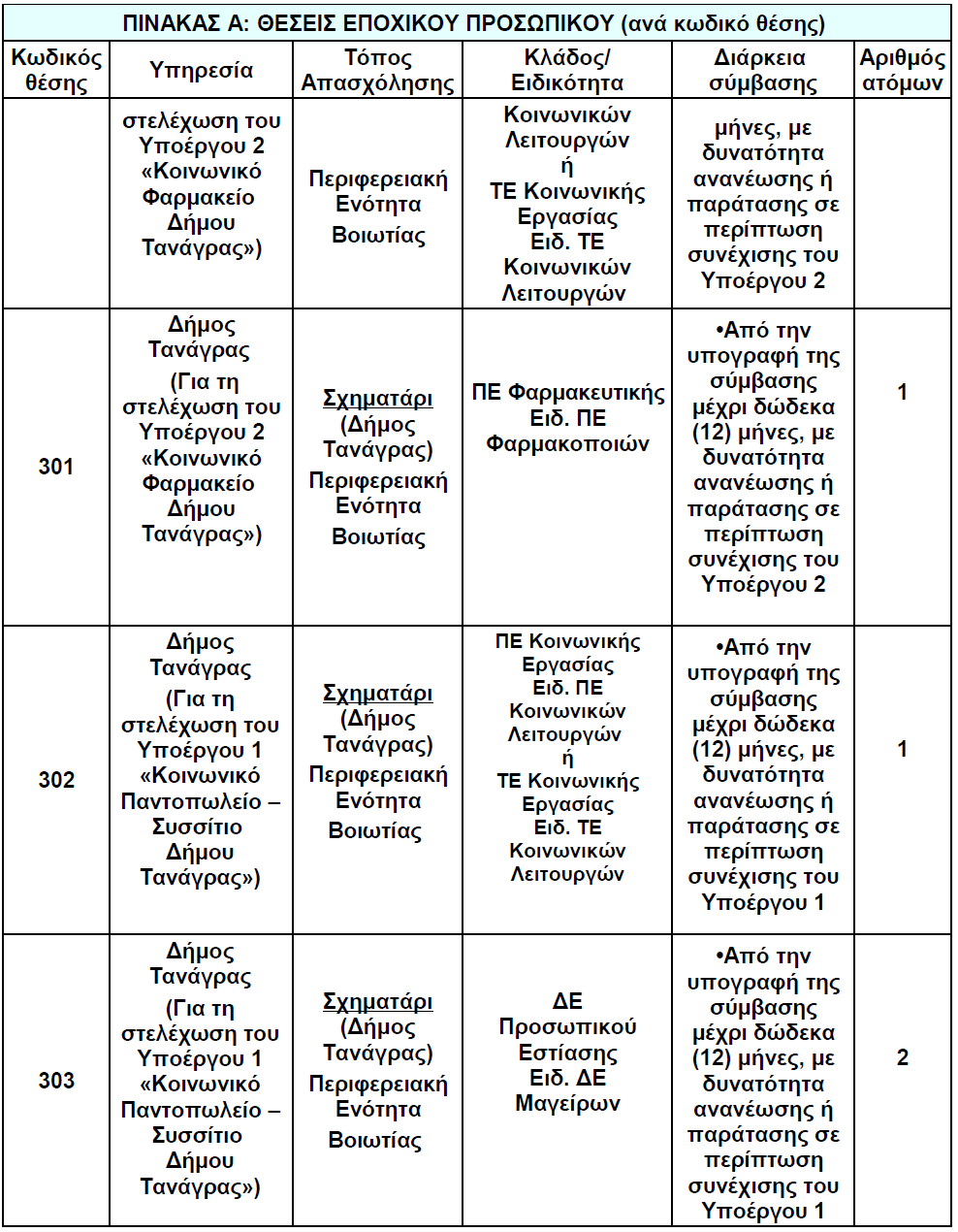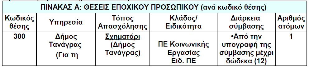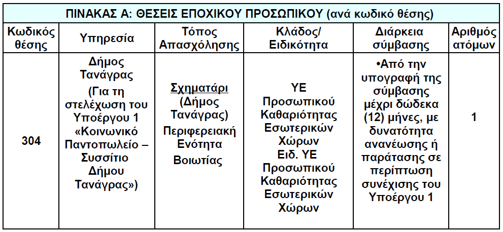 Ο Δήμος Τανάγρας ανακοινώνει πρόσληψη, με σύμβαση εργασίας ιδιωτικού δικαίου ορισμένου χρόνου, συνολικά έξι (6) ατόμων για την υλοποίηση των Υποέργων (1) και (2) της Πράξης «Δομές Παροχής Βασικών Αγαθών – Νέες Δράσεις Δήμου Τανάγρας».